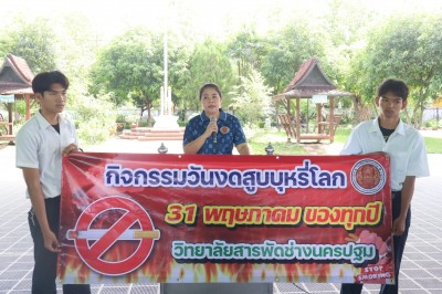 วันที่ 31 พฤษภาคม 2567 👉นางสาวพรทิพย์ ภักดีนอก ผู้อำนวยการวิทยาลัยสารพัดช่างนครปฐม พร้อมด้วยรองผู้อำนวยการฯ คณะครู บุคลากรทางการศึกษา และนักเรียน จัดกิจกรรมการให้ความรู้เรื่อง พิษภัยของบุหรี่/บุหรี่ไฟฟ้า รวมถึงการสร้างภูมิคุ้มกันให้ปลอดจากการสูบบุหรี่/บุหรี่ไฟฟ้า ณ อาคารหอประชุม วิทยาลัยสารพัดช่างนครปฐม และเดินขบวนรณรงค์ปกป้องเด็กและเยาวชนจากบุหรี่และบุหรี่ไฟฟ้า เนื่องในวันงดสูบบุหรี่โลก ป้องกันไม่ให้เกิดนักสูบหน้าใหม่ ณ บริเวรณ ตำบลหนองดินแดง อำเภอเมืองนครปฐม จังหวัดนครปฐม